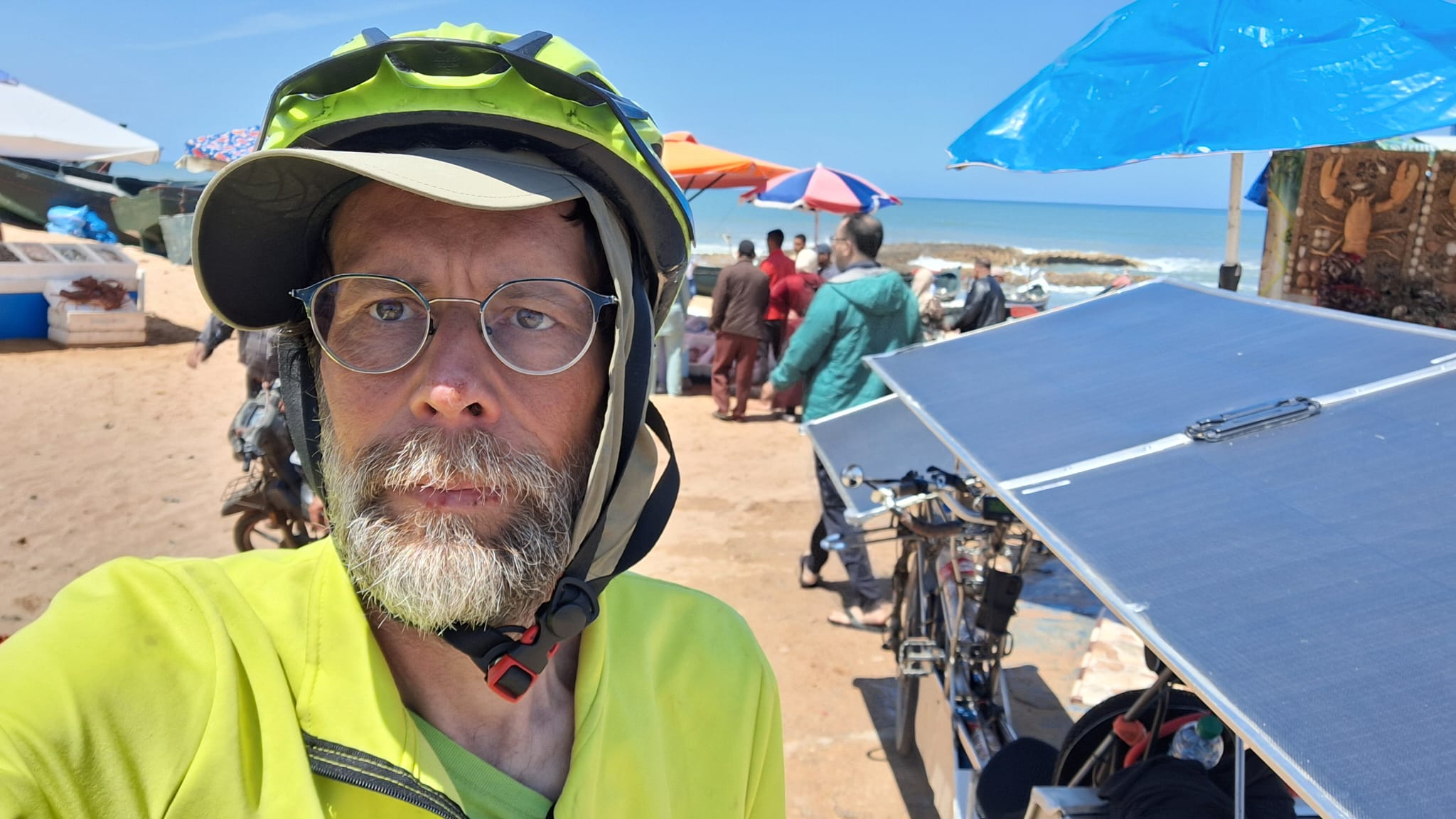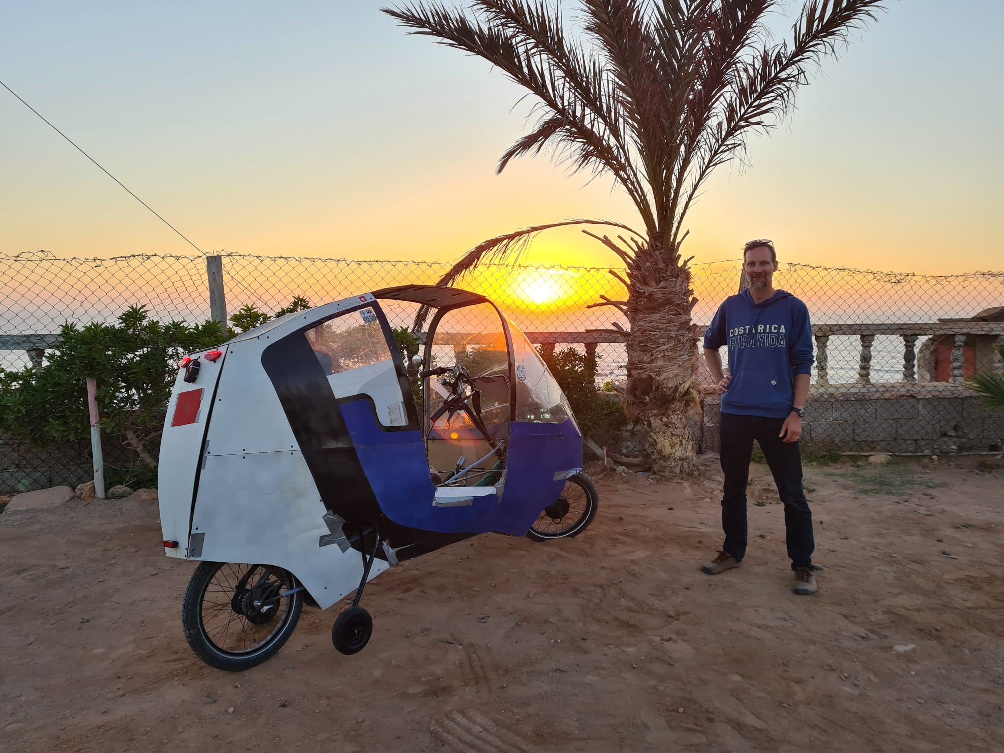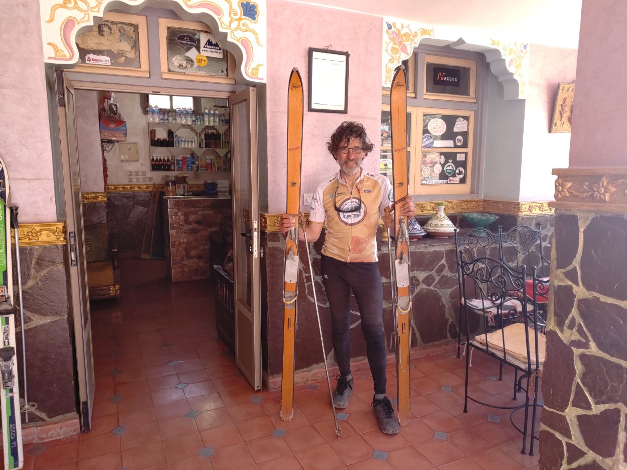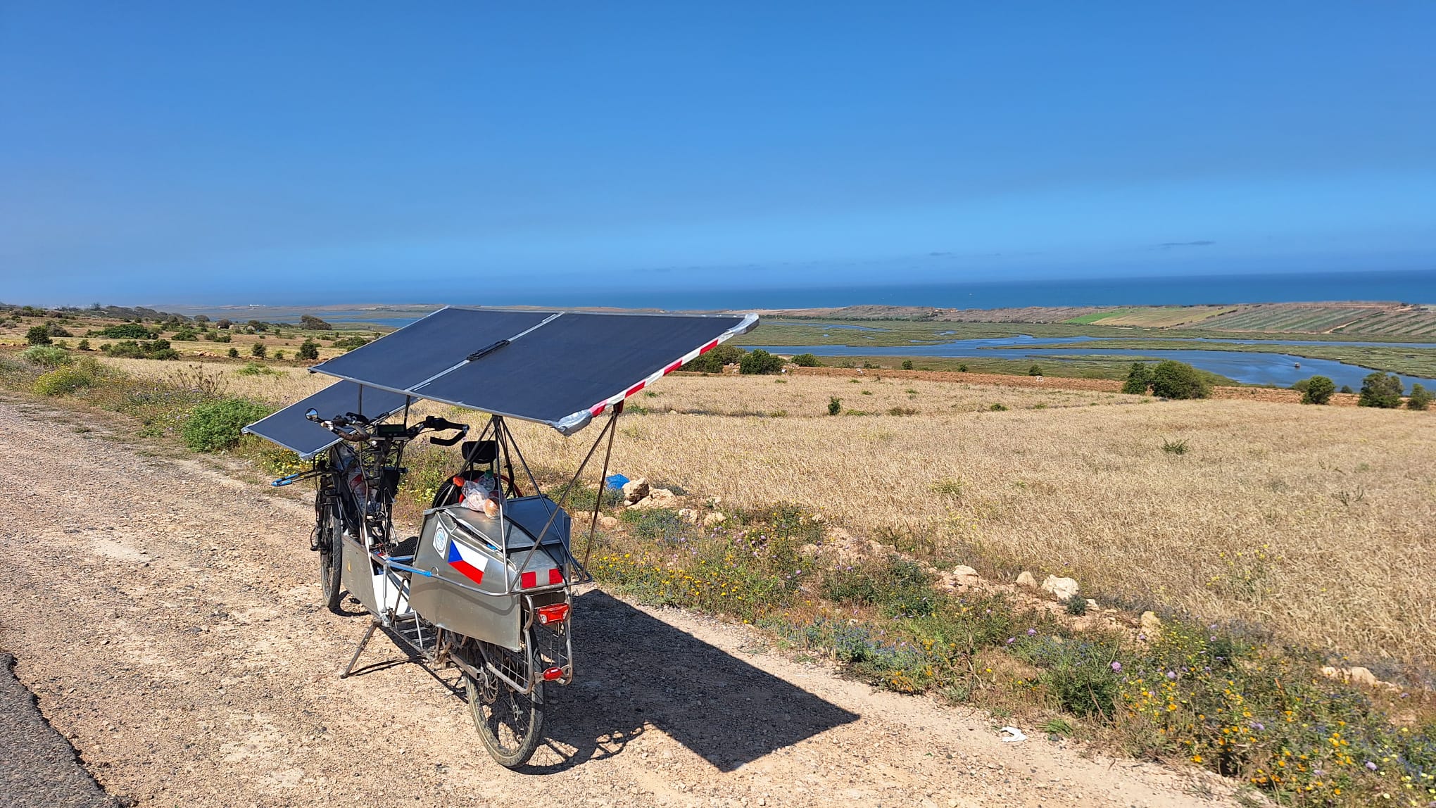 Jean-Louis : Mes batteries ne sont pas très remplies depuis ce matin. J’oscille entre 40 et 30% jouant avec l’énergie reçu des panneaux. En effet quand mes panneaux fournissent 330 W à mes batteries, je ne tire que 280 W pour mes moteurs. Je peux ainsi me targuer de dire que je charge mes batteries en montant Tizi N’test … Puis enfin le Col arrive au bout d’une route sommitale presque plate. Un restaurant trône au Col et c’est naturellement que je mis engouffre. J’attendais ce moment impatiemment. J’avale une bonne omelette aux poivrons et autres crudités, excellente ! Après une heure le cycliste et le vélo sont bien rechargés, il est temps de s’asseoir dans sa chaise longue que constitue mon vélo couché. » La suite sur son Polarsteps.