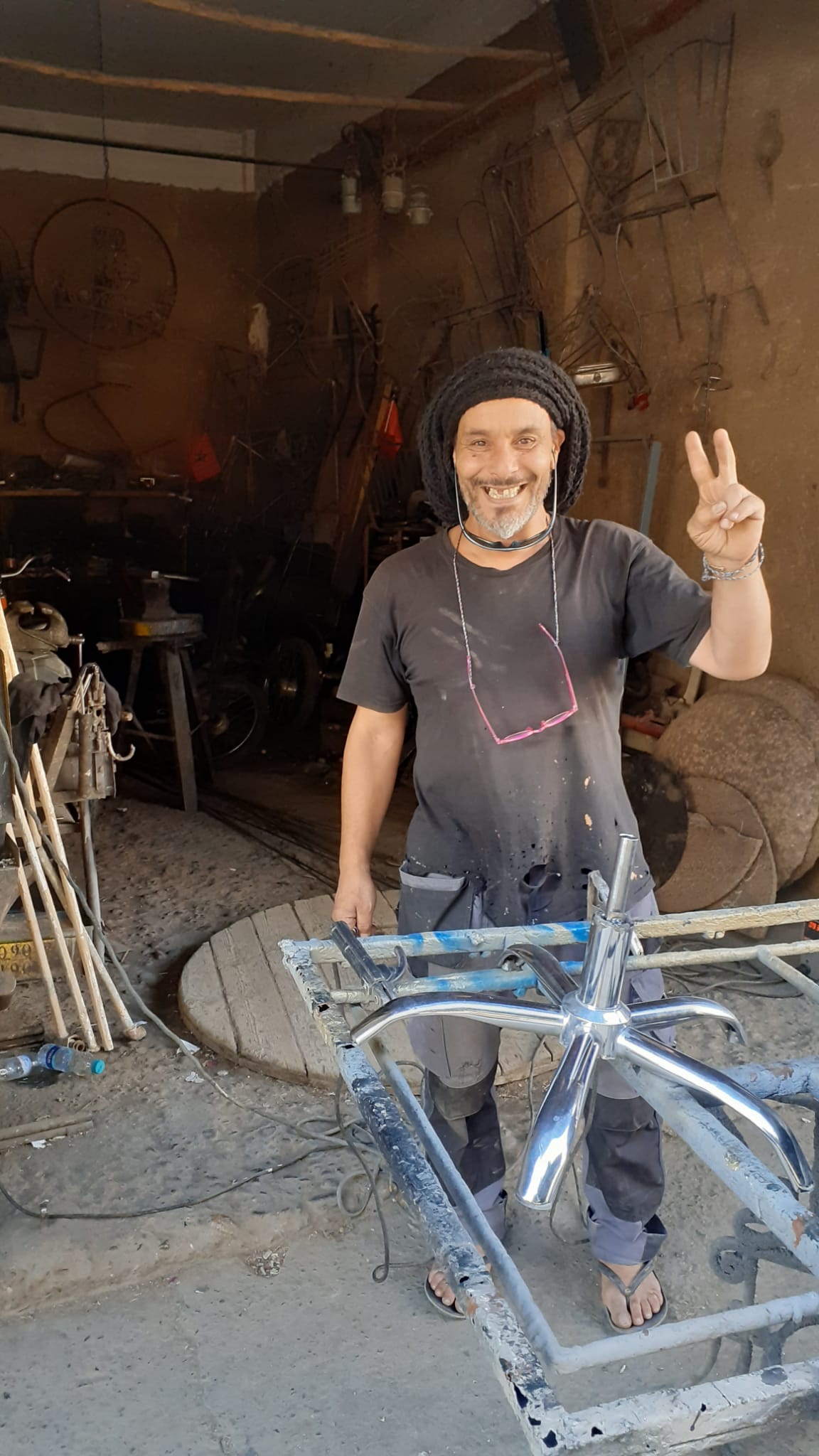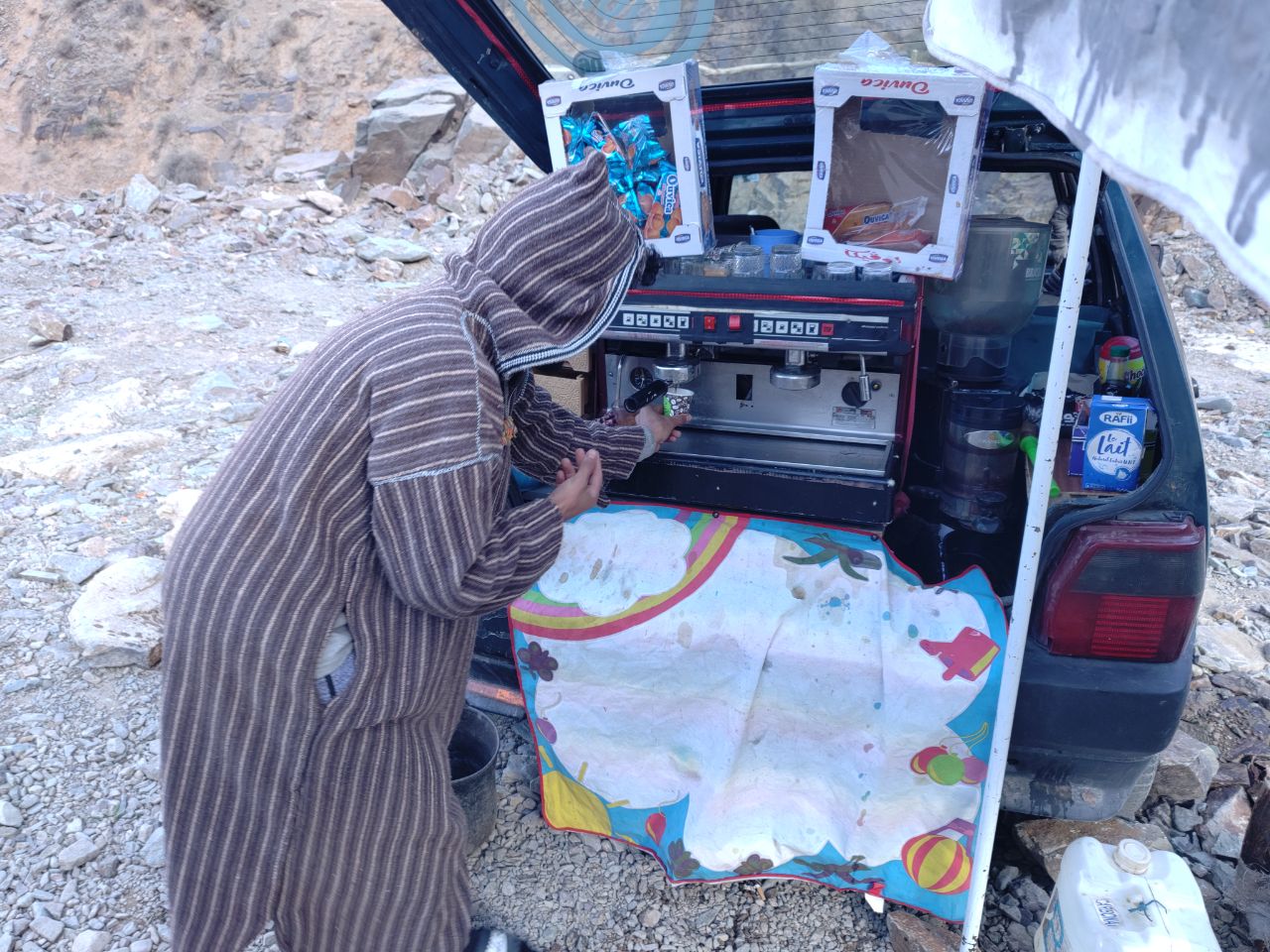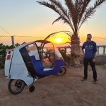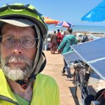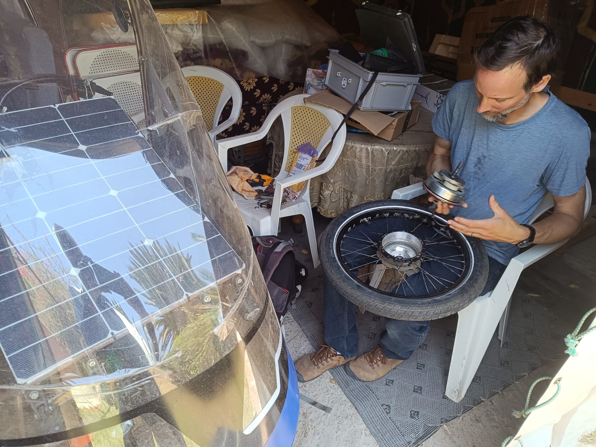 Jean-Louis : Mes batteries ne sont pas très remplies depuis ce matin. J’oscille entre 40 et 30% jouant avec l’énergie reçu des panneaux. En effet quand mes panneaux fournissent 330 W à mes batteries, je ne tire que 280 W pour mes moteurs. Je peux ainsi me targuer de dire que je charge mes batteries en montant Tizi N’test … Puis enfin le Col arrive au bout d’une route sommitale presque plate. Un restaurant trône au Col et c’est naturellement que je mis engouffre. J’attendais ce moment impatiemment. J’avale une bonne omelette aux poivrons et autres crudités, excellente ! Après une heure le cycliste et le vélo sont bien rechargés, il est temps de s’asseoir dans sa chaise longue que constitue mon vélo couché. » La suite sur son Polarsteps.