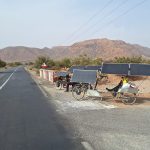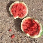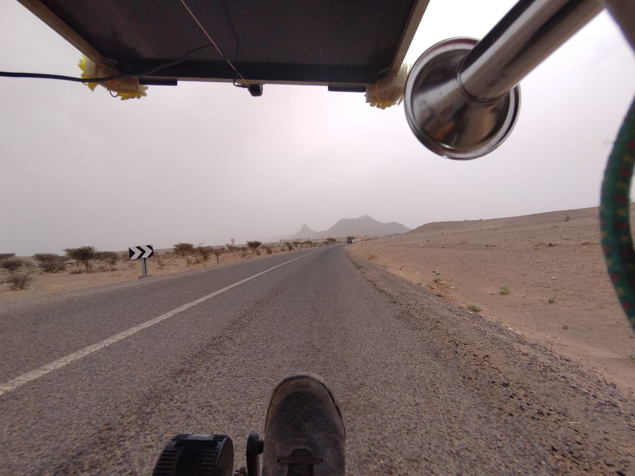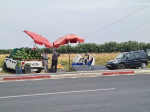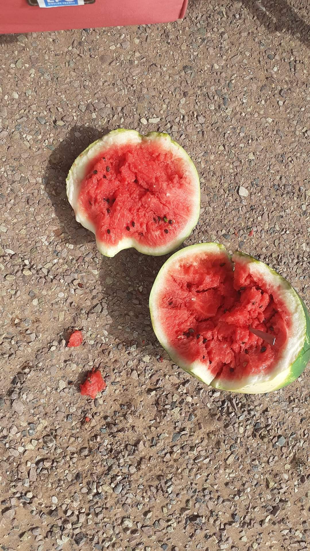 Le soleil est apparu une bonne partie de l’après-midi, de quoi m’apporter les kW manquants. Mais surtout 130km sans rien (c’est le désert… heureusement les gens s’arrêtent quand tu te reposes sur ton vélo pour voir si tout va bien)… donc ni boutique, ni station service… (juste une mosquée !)… bref, pas de ravitaillement, sauf… un champ de pastèques abandonné ».