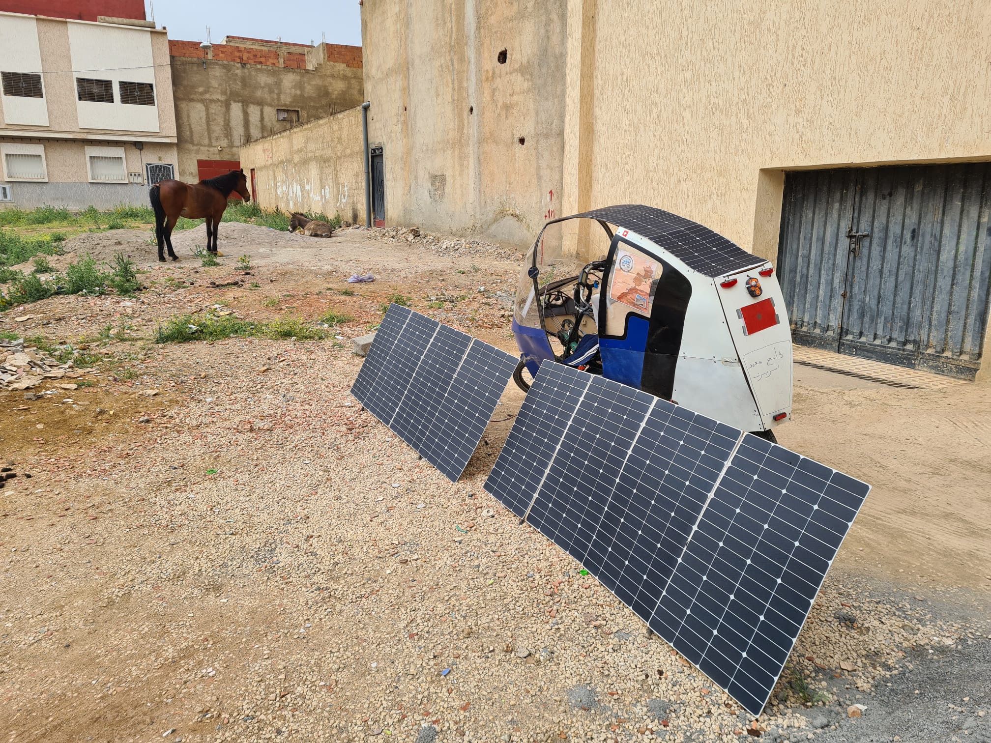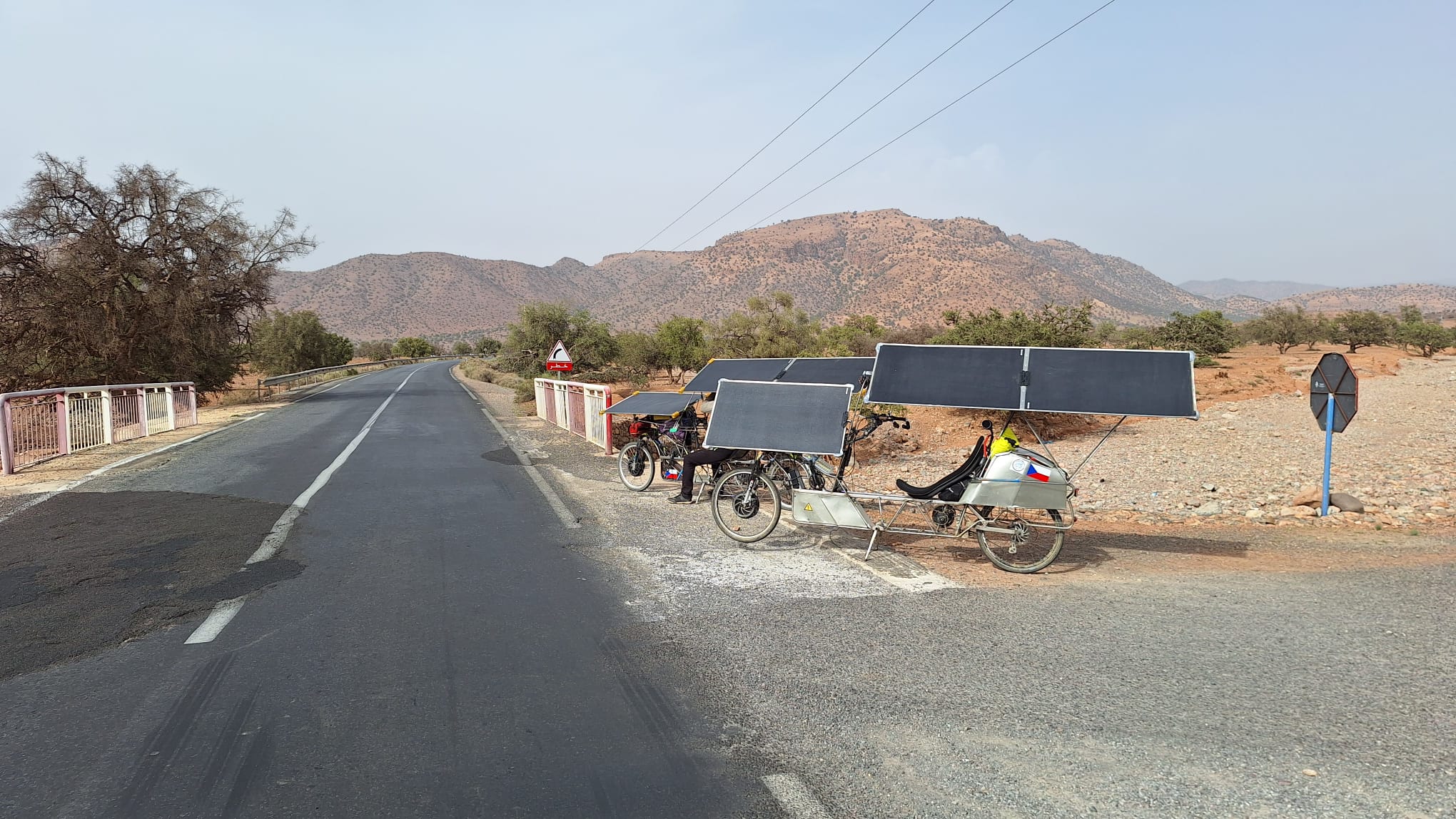 Michael & Jiri : « Finalement on ne change pas les panneaux solaires, on prend la route directe pour Boulmane Dades depuis Taroudant. C’est très beau. On ne suit pas tout le parcours du Sun Trip, pardon, mais on doit adapter pour rester dans notre timing. C’est une superbe expérience ». Leurs balises seront grisées sur la carte du fait du non respect du parcours, mais on continue de les suivre.