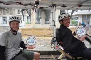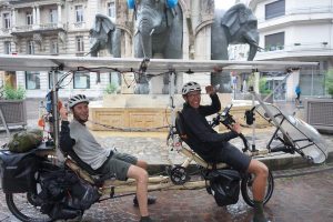 « On avait de fortes ambitions au départ, malheureusement la météo dans les Pyrénées nous a condamnés d’emblée, c’était pas facile à vivre. Ensuite nous avons vraiment roulé très fort, trop fort certainement car la machine a commencé à fatiguer. Dès le Portugal notre jante arrière a craqué. On a du changer de roue et nous nous sommes dit qu’il fallait rouler de manière un peu plus douce« . Globalement leur fabuleux tandem a bien fonctionné, mais le poids d’un tel engin à forcément un impact : « Au dessus de 6% de pente nous étions vraiment en difficulté, donc nous avons essayé d’éviter les montagnes autant que possible. Au final on ne sait pas si un tandem est vraiment adapté pour faire la course sur un Sun Trip, mais c’était quand même un voyage fou, c’est notre plus grande expérience de vie ! ».