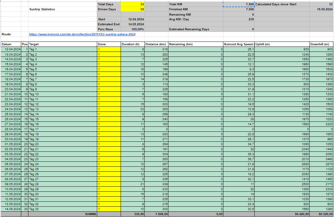 Sur leur compteur plusieurs chiffres à relever : 7508 km au total (soit encore environ la même route que Jean-Marc Dubouloz), une moyenne journalière de 235 km, 50420 mètres de dénivelés positifs, un record de distance journalière à 319 km !