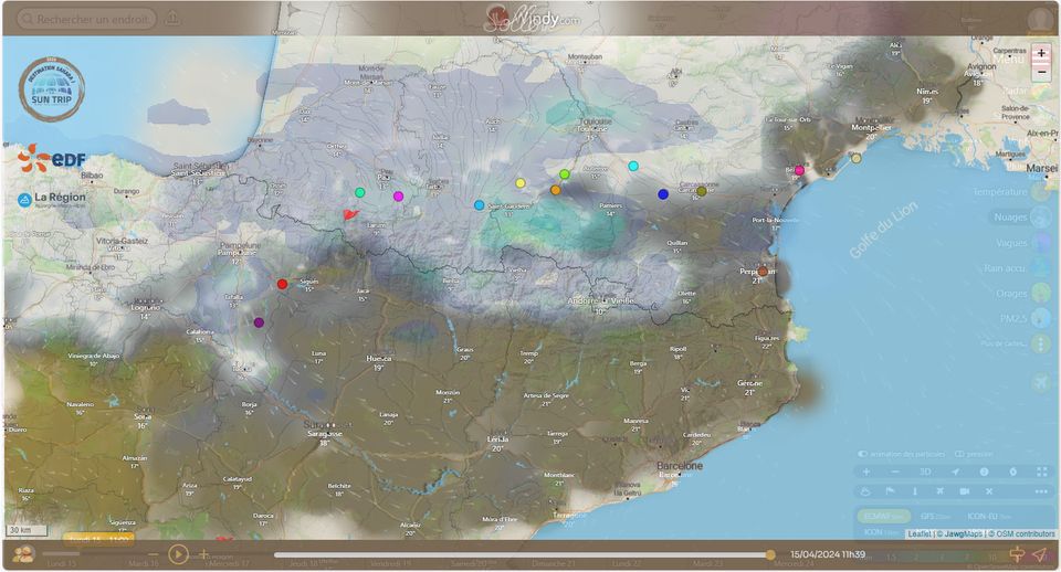 Dans le groupe en approche de la frontière, seul Patrice Plozner a eu du soleil, lui qui tente un coup de poker en contournant les Pyrénées par le Sud, ce qui est plus long mais a priori plus ensoleillé. Pour le moment il reste très éloigné du checkpoint 1, mais l’avenir nous dira si sa stratégie était payante.