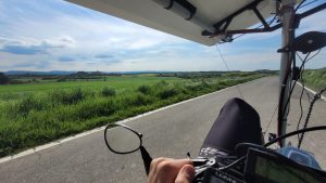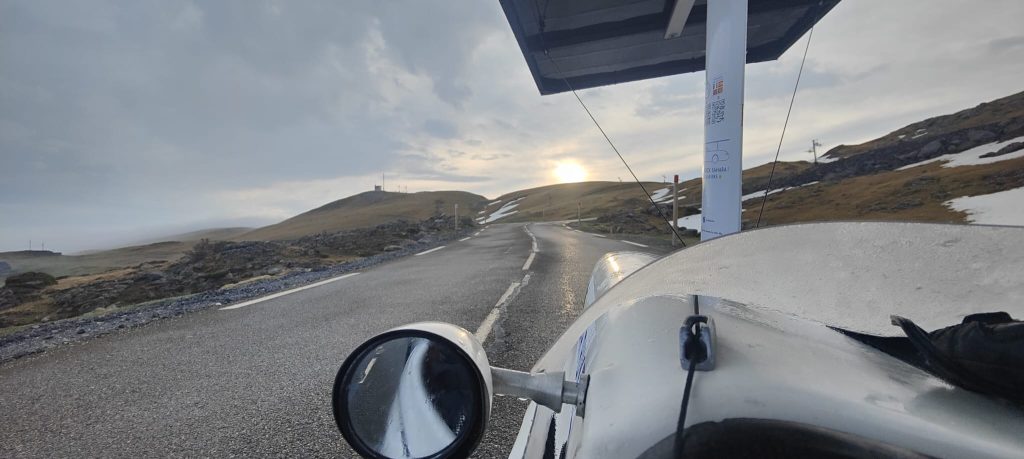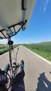 En tête de groupe la course pour la victoire fait rage entre Jack Butler et Jean-Marc Dubouloz. Hier l’écart a fluctué entre 80 km et 40 km, avec des zones de vent de côté qui n’ont pas avantagées le vélomobile et aussi avec les aléas liés à la présence nombreuse de la police des routes en Espagne… Au final Jean-Marc réalise 340km sur la journée, Jack 282 km. L’écart au soir de la 4ème étape était de 25 km seulement entre les deux ! Devant eux la piste semble dégagée pour poursuivre leur rallye, le soleil étant annoncé jusqu’au Checkpoint 2, sous Lisbonne, et le vent devant progressivement se remettre 100% favorable. Autant dire que ça ne risque pas de ralentir tout de suite !