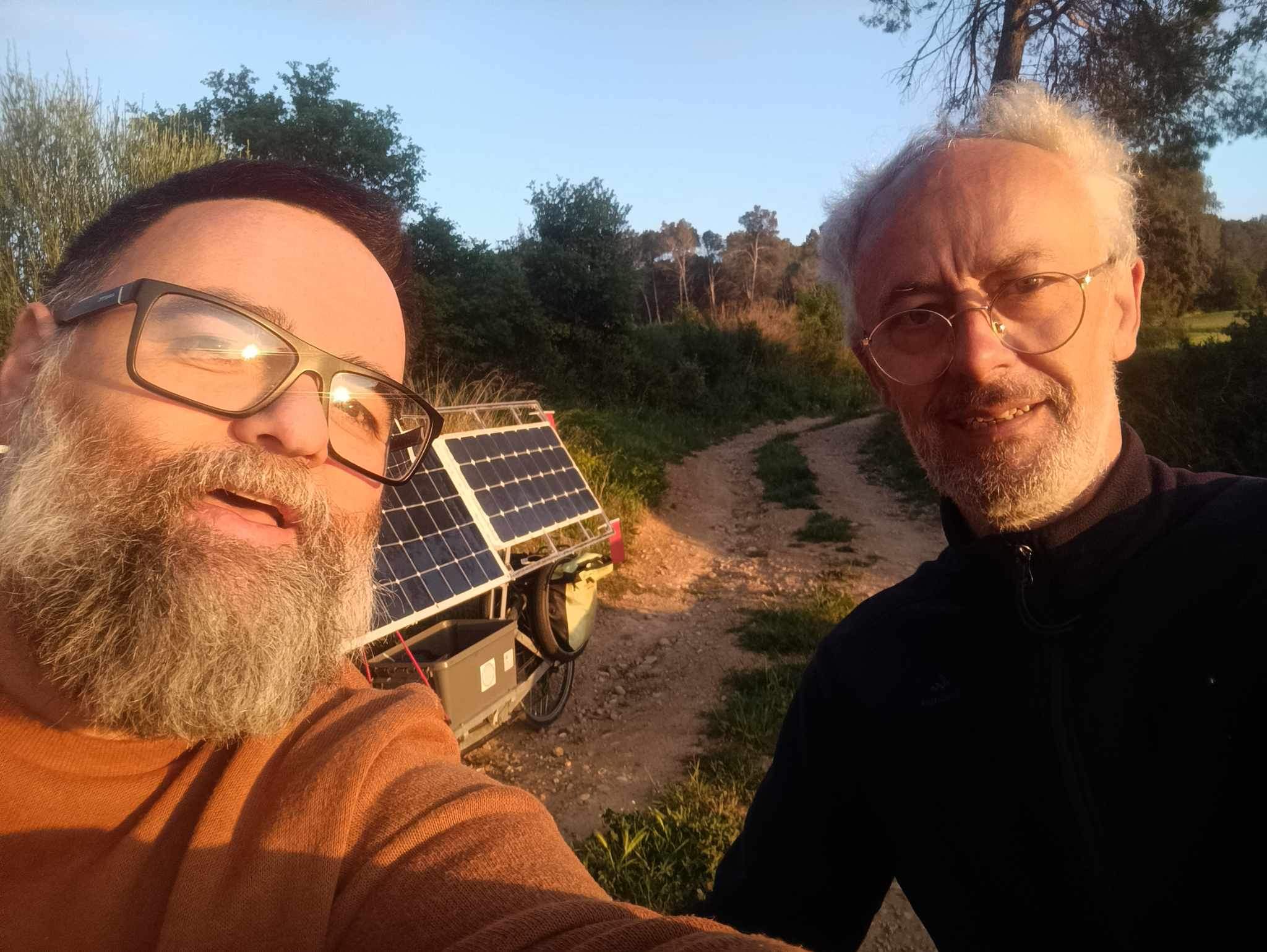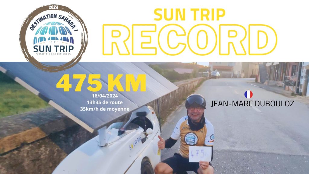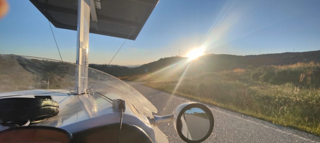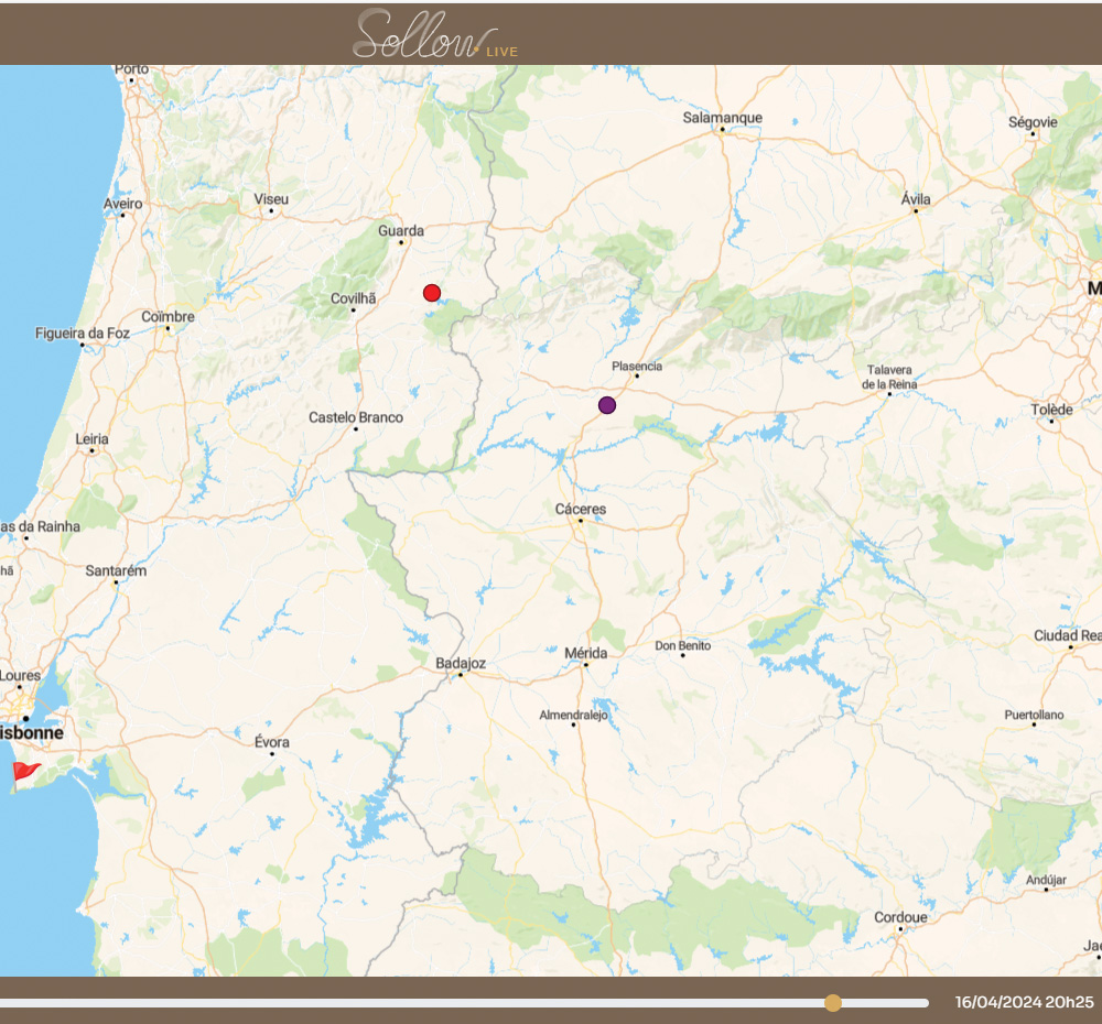 Puis les choses ont basculées en fin d’après-midi. Jean-Marc Dubouloz a commencé par reprendre la tête peu après avoir passé Salamanque, puis il a sans cesse tenu son rythme effréné, pour finalement pouvoir envisager de passer la frontière portugaise avant 20h30, heure où les participants doivent stopper leur route. En passant la frontière, à 19h30 (heure françaises de départ) il change de fuseau horaire et gagne donc une heure de route ! De quoi rouler encore deux heures pour finalement pulvériser son record de km journalier réalisé en 2021 lors du Sun Trip Europe, en affichant un incroyable 475km, pour 13h35 de route à 35km/h de moyenne, le tout en 100% recharge solaire bien évidemment ! Il écrit donc une nouvelle page de l’histoire du Sun Trip, en partie aussi grâce à son formidable concurrent Jack Butler, qui réalise lui 375km dans la journée. Difficile de dire s’il sera possible d’aller plus vite dans les déserts marocains, mais par contre on peut dire que les deux hommes arriveront sur la côte Atlantique ce 17 avril, sauf catastrophe. 5 jours pour passer de Lyon à Lisbonne à vélo, voilà un chiffre que nous n’oublierons pas !
