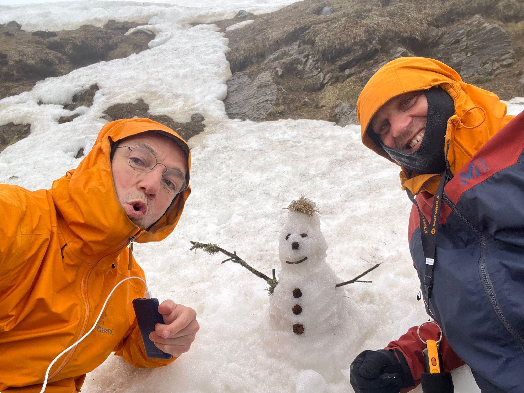 Pour autant le groupe garde le sourire et continue d’avancer et les exploits sont au rendez-vous ici aussi. Que dire de la journée de Vivien Dettwiler… tombé en panne de batterie la veille dans la montée du col de la Pierre Saint Martin, il a mis la journée entière pour faire 10 km ! « Une montée si raide, sous la pluie, avec un vélo fait pour le soleil, c’est un immense challenge! ». Mais le suisse est finalement passé, à 17h15, suivi deux heures plus tard par le duo belge Géry & Baudouin qui ont fait une montée du col hyper rapide. Les amis belges reviennent ainsi à la 4ème place ex-aequo, avec en prime un bon bonhomme de neige fait en haut du col.