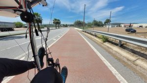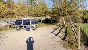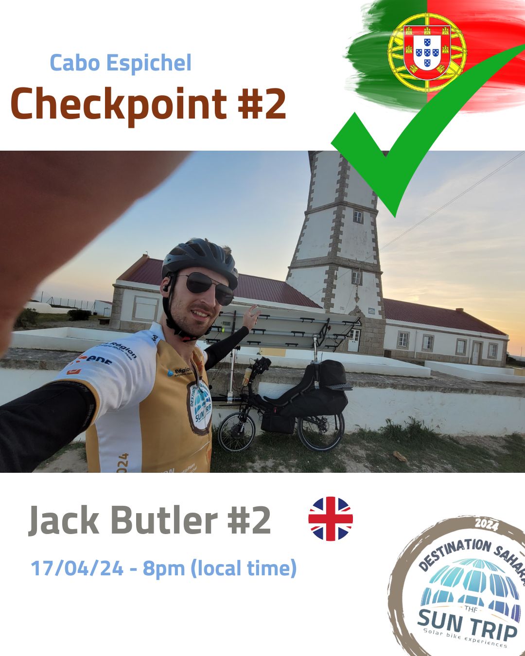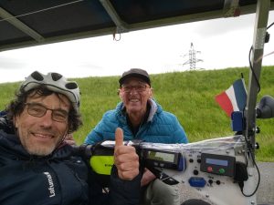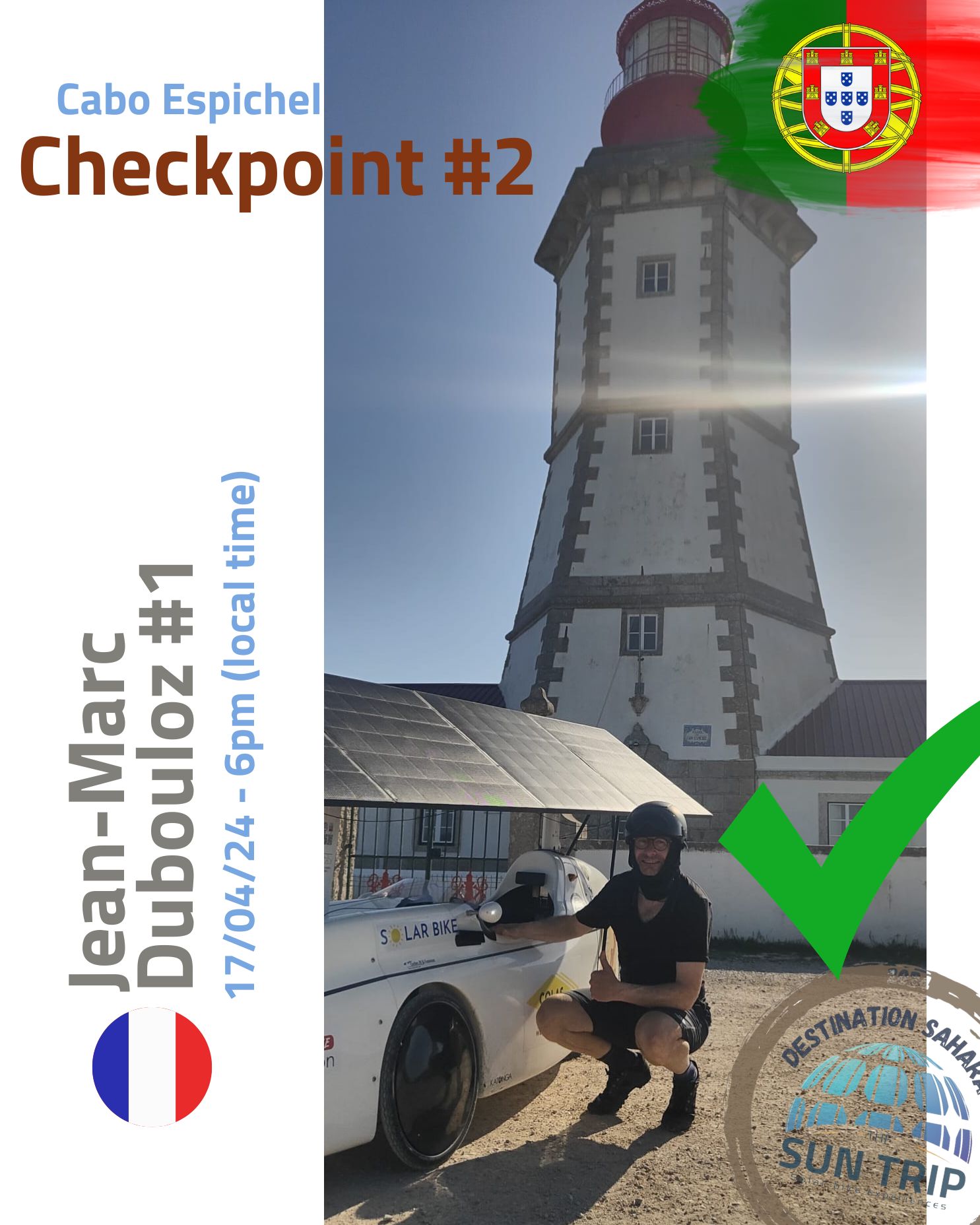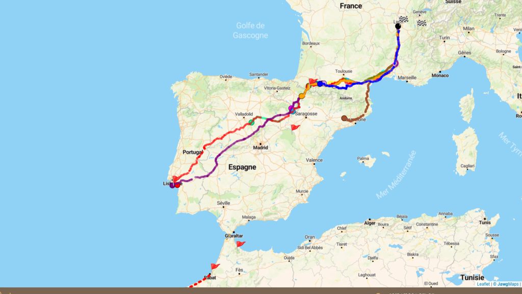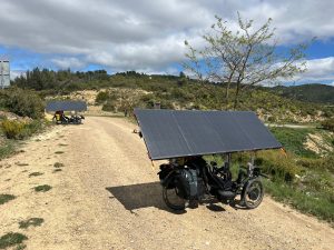 Tous regardent par ailleurs de loin le show proposé par les deux leaders, qui ont atteint ce 17 avril le checkpoint 2, à moins de 2 heures d’intervalles ! 1900 km en 5,5 jours depuis Lyon, c’est une performance immense, rendue possible par leur détermination, par un soleil présent tous les jours pour eux et par un bon vent ! Ils ont certainement bénéficié des meilleures conditions pour voyager à vélo solaire entre Lyon et Lisbonne, à un rythme de 345 km par jour en moyenne !