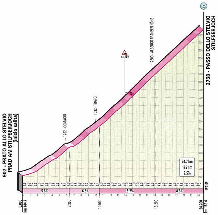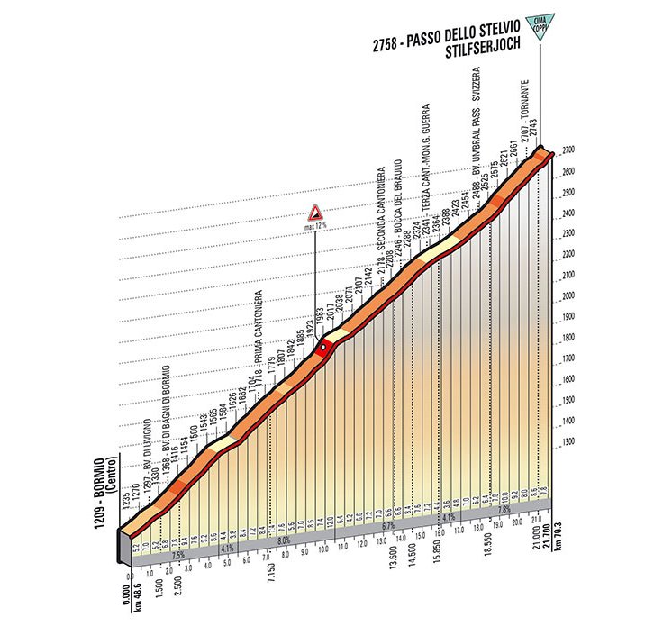 Situé dans l’extrême Nord de l’Italie, tout près de la Suisse, le Stelvio fait figure de mythe, il est reconnu comme un des cols le plus difficiles des Alpes. La montée qui devrait être privilégiée par nos aventuriers, depuis le village de Prato, propose une pente de 24 km à plus de 7% de moyenne, avec une pente plus proche des 9% sur les 15 derniers kilomètres ! Autant dire que les moteurs et les jambes vont sacrément chauffer sur cette ascension et les engins les plus lourds pourraient avoir des difficultés pour atteindre le sommet.