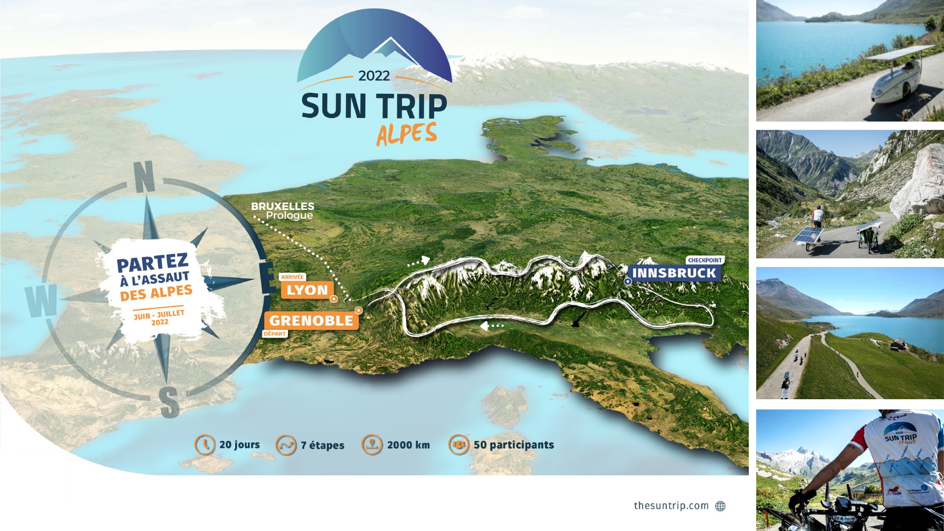 Le Sun Trip Alpes sera un nouveau grand et beau chapitre de notre dynamique, avec une traversée de 6 pays (dont 5 pays membres de l’Union européenne). Une boucle d’un peu plus de 2000 km, avec 7 grandes étapes et des accueils tous les 2 à 4 jours qui sera une occasion unique d’aller découvrir la richesse et la diversité des Alpes.
