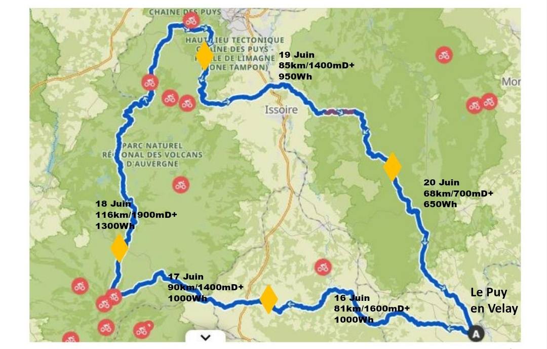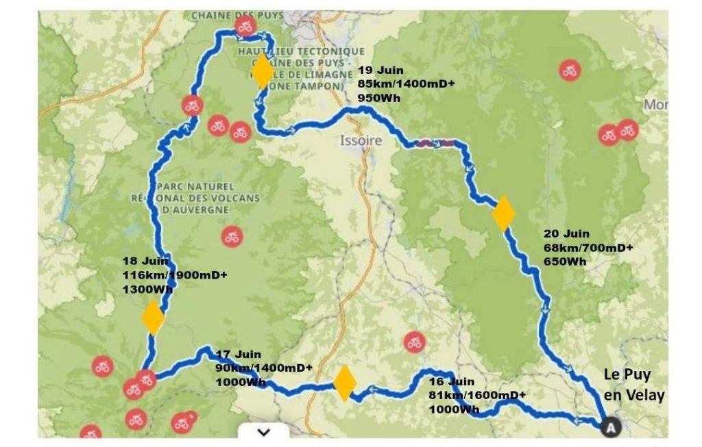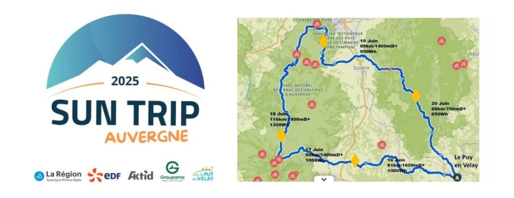 Après nos escales en 2017 et 2019, avec les deux éditions Sun Trip Auvergne-Rhône-Alpes, puis en 2022 avec le Tour de France, le Sun Trip retrouve l’Auvergne à l’occasion de la seule édition française de cette année 2025. Au programme une jolie boucle de près de 500km, à réaliser en 5 étapes, au départ du Puy-en-Velay, avec une traversée des Monts d’Auvergne puis un passage par les Monts du Forez. Le dénivelé positif sera de 7000 mètres !