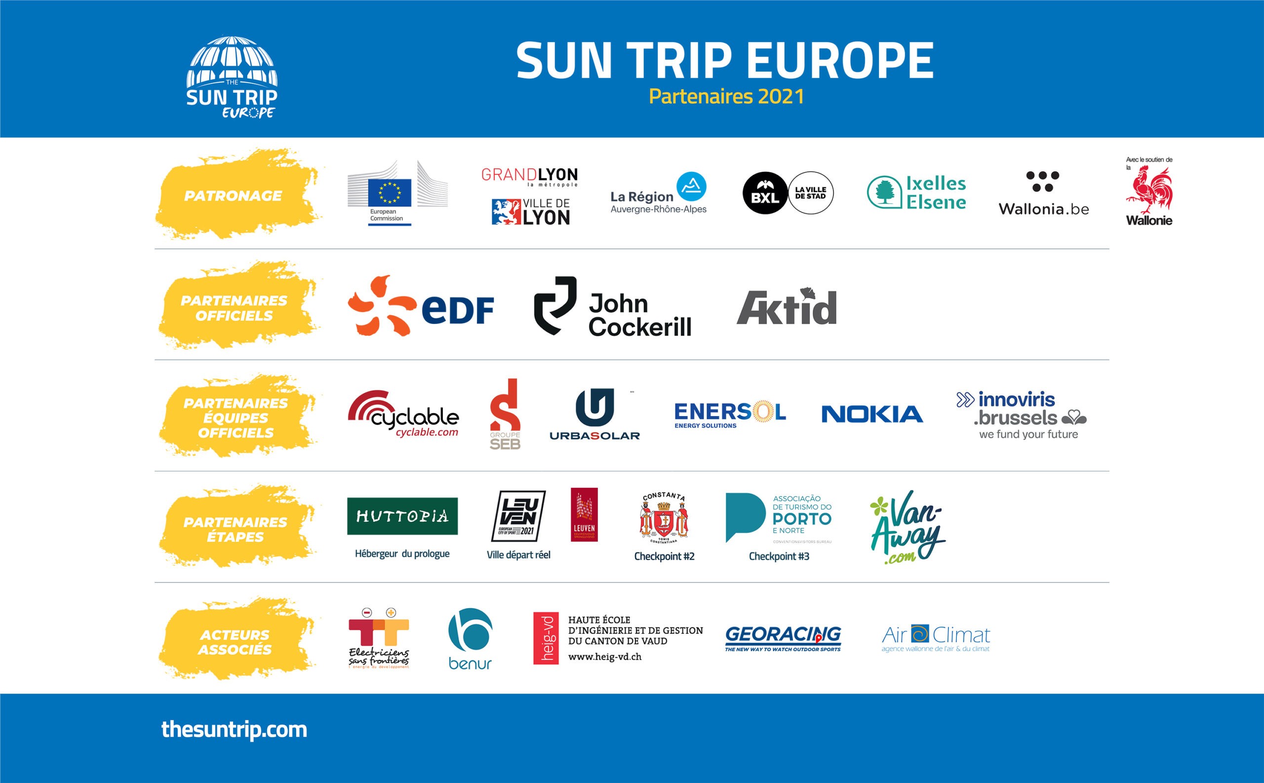 Nous sommes fiers d’avoir pu mobiliser plus de 15 partenaires, sur ce projet européen, des partenaires privés et institutionnels, fidèles et nouveaux dans l’aventure. Dans le contexte de crise que nous connaissons, leurs soutiens est une vraie marque d’adhésion aux valeurs du Sun Trip. Merci !