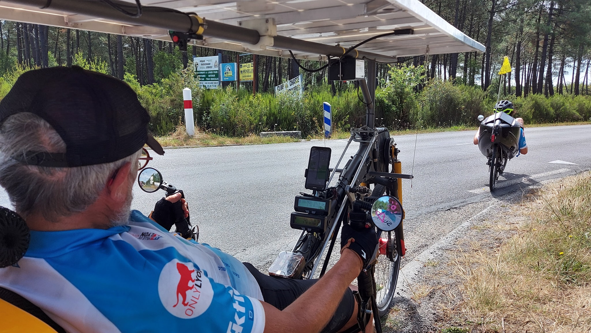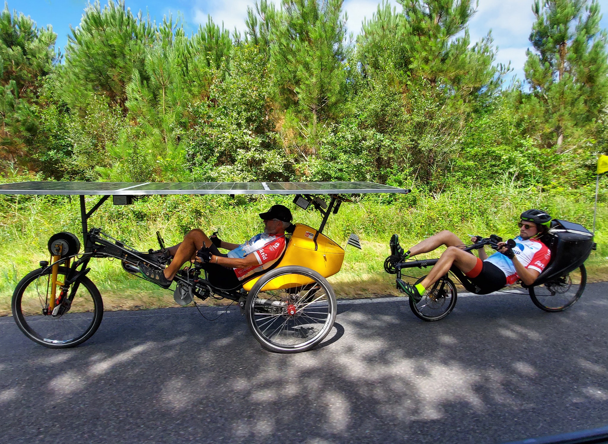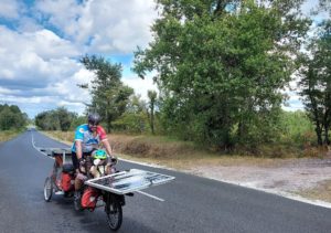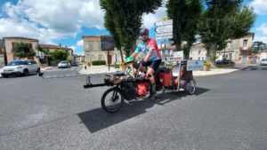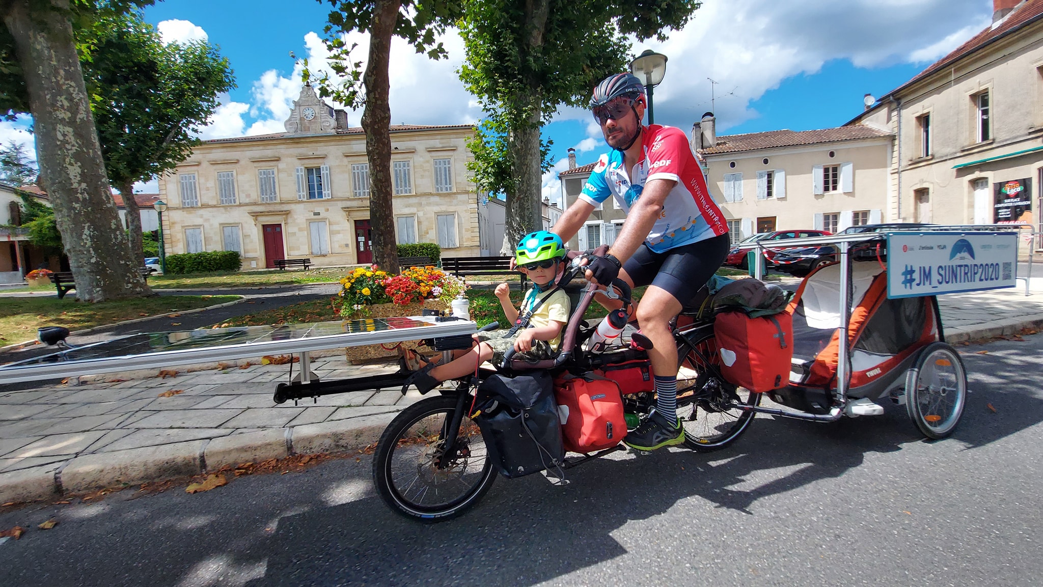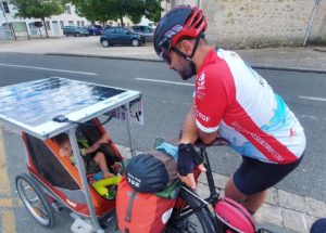 D’un coté Bernard, star du Sun Trip, qui reconstitue le duo 2018 avec son fils Yann le temps de l’étape de Pau. De l’autre Johan, nouveau dans le projet, qui a eu l’audace de se lancer dans l’aventure (avec un temps de retard suite à une casse moteur) avec son petit Léon, 3 ans. Deux histoires qui montrent que l’aventure solaire peut être l’occasion de moment de partage tout à fait exceptionnel, l’assistance du vélo permettant de réunir les générations.